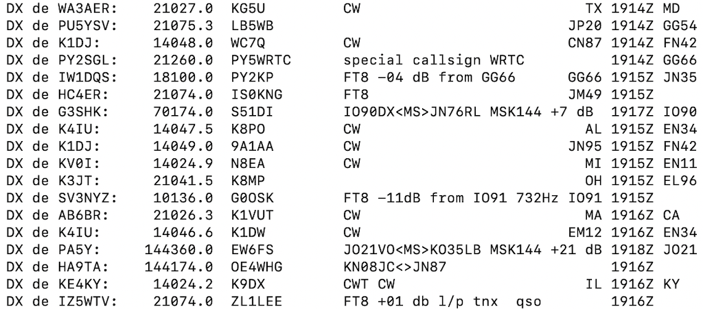 If you want a full feed from everything coming out of the RBN, you can get it on my DX Cluster. Once you’re logged on, use the set/skimmer command to open the firehose! For more information on how to use the RBN feed, use the help rbn and help set/skimmer commands. To disable the RBN feed, use unset/skimmer