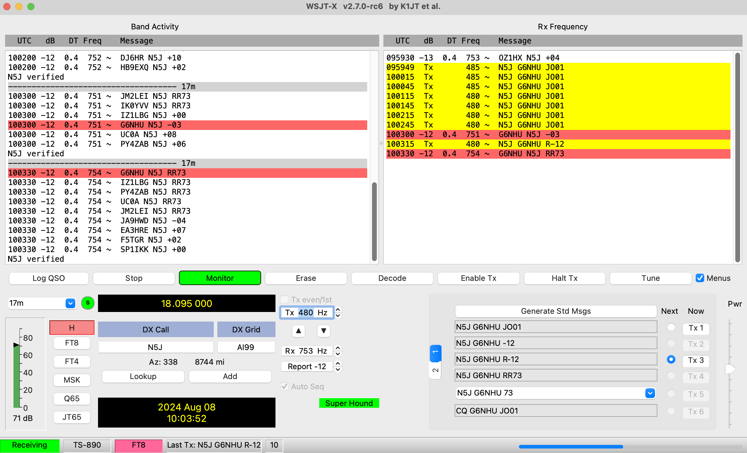 I set up HamAlert notifications specifically for N5J with the source set as G, GM and GW in the hope that if they were seen locally, I’d have more chance and just before 10:00z this morning, I had an alert for them being on 17m FT8.