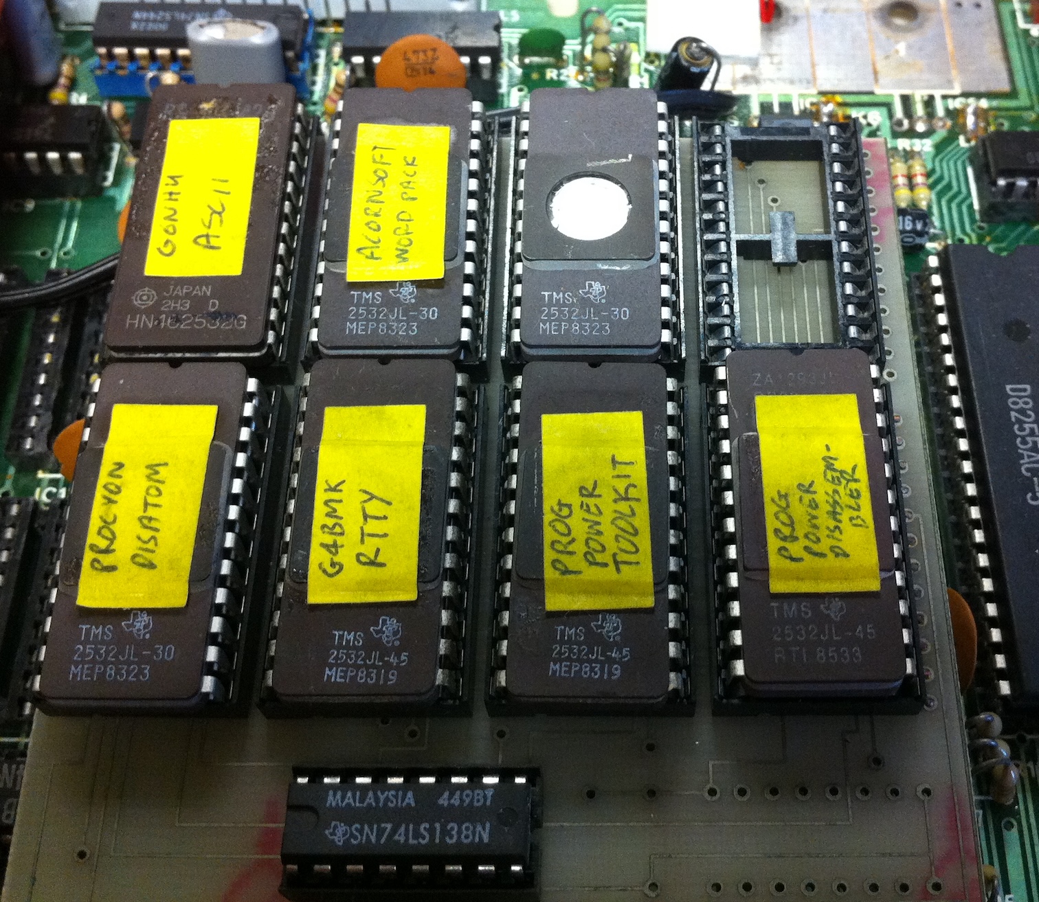 The RTTY software I used was written by G4BMK and was supplied on EPROM. Here it is inside the Acorn Atom on an EPROM expansion board. You’ll notice there’s one called G6NHU ASCII. At the time, a group of us were also experimenting with different data modes over the air and I wrote some software to send and receive ASCII so my log is strewn with comments about “testing ASCII, failed” or “ASCII test, all worked“. It must have been reliable in the end otherwise I wouldn’t have blown the software to an EPROM.